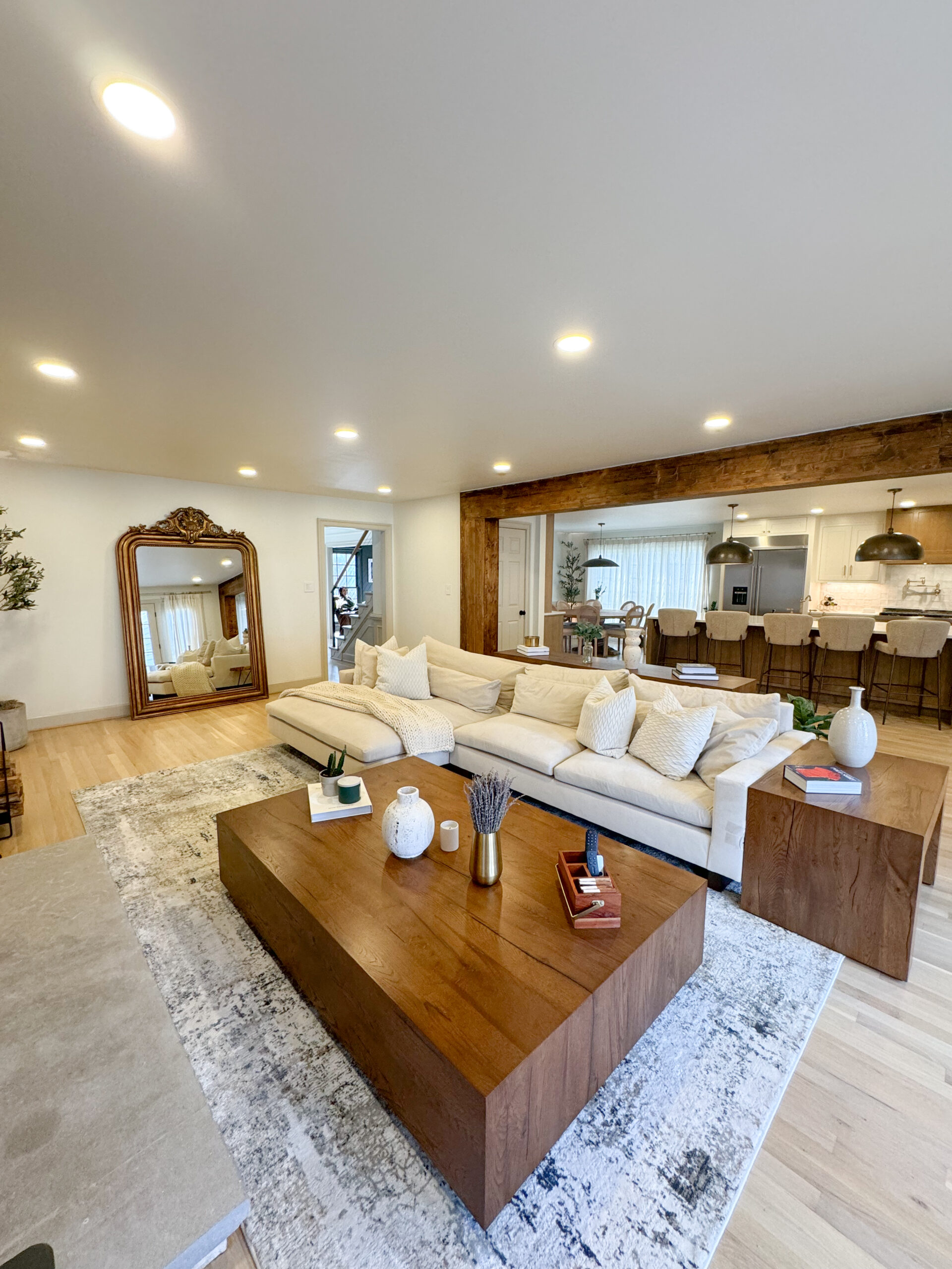 High-end appliances were installed to boost functionality, and a spacious island was added for casual dining and extra workspace. Custom cabinets with organizing accessories and a dedicated coffee bar enhanced both storage and style.